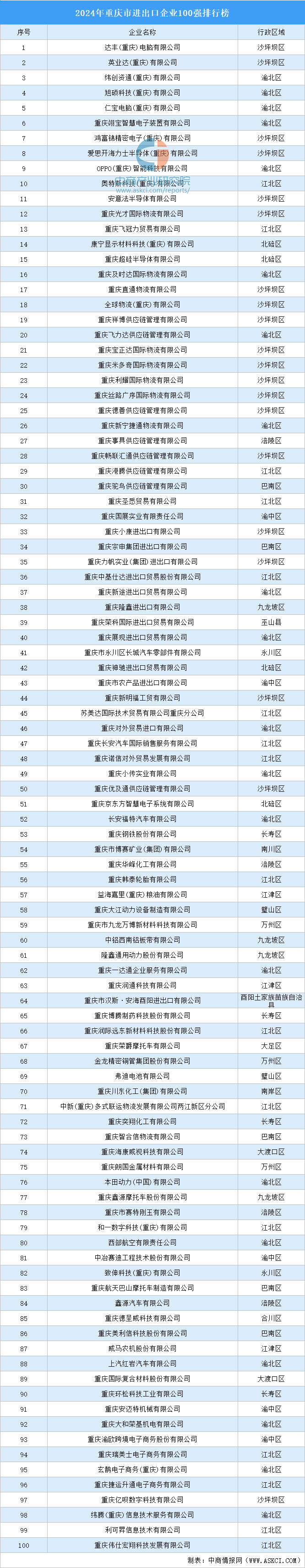 中商谍报网讯:3月13日,进出口商会2024年度会员大会暨“稳增量、进出口企业100强榜单揭晓,达丰电脑无限公司等100家企业上榜。进出口企业100强企业中,渝北区、沙坪坝区各上榜企业100家企业,江北区16家企业上榜,渝中区、巴南区各5家企业上榜。